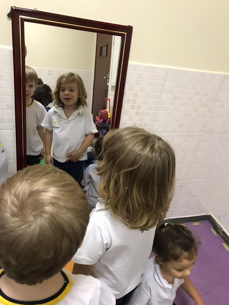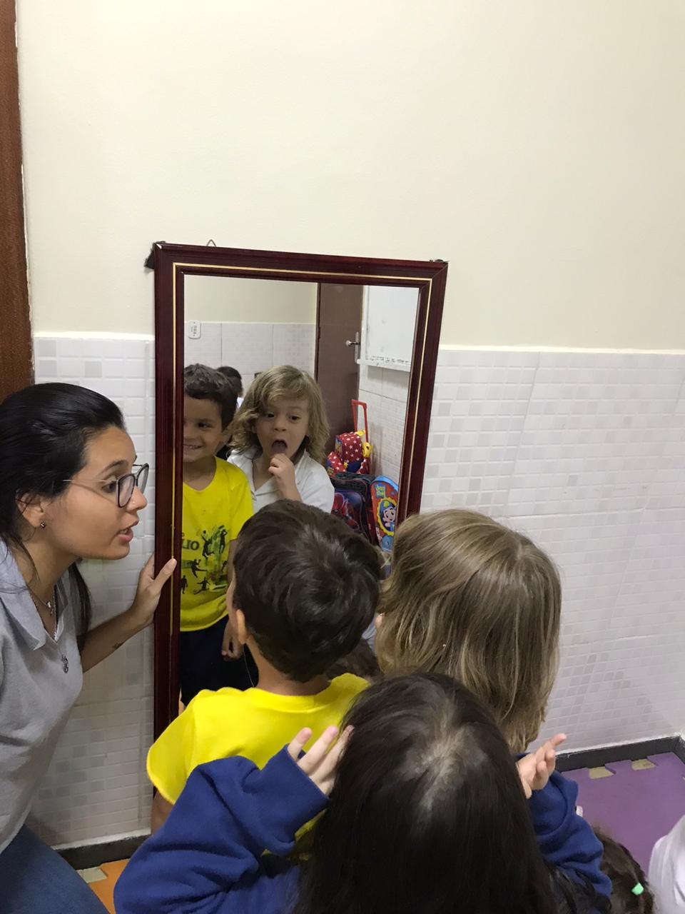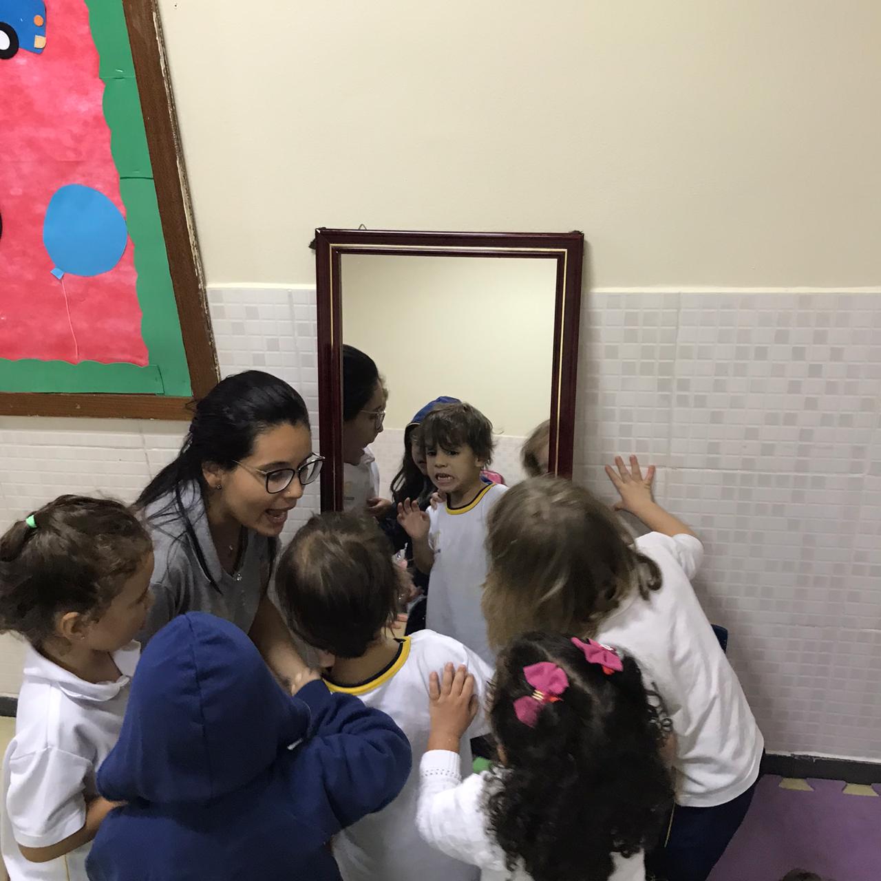 Atividade Anglo! Trabalhando a percepção dos membros do corpo humano através da própria imagem vista no espelho.