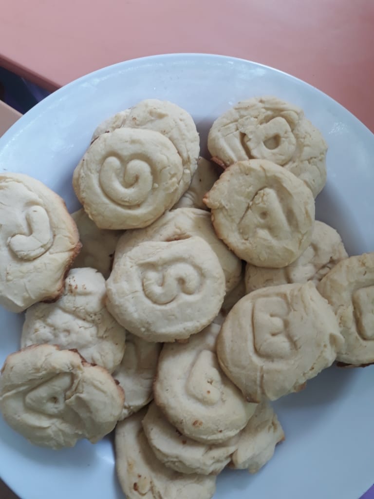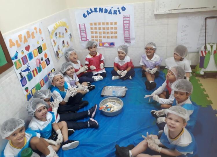 Atividade Anglo!! Exploramos a contagem de ingredientes e utensílios utilizados. Ao final, cada aluno carimbou com a forminha a inicial da letra do seu nome.